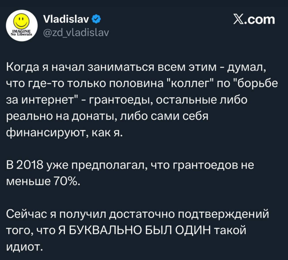 Все борцы за "свободный интернет" грантоеды, один я не такой Какой принципиальный товарищ. Как он себе рассказзывает. После закрытия USAID волна офигительных историй про честных борцов и плохих грантоедов накрыла отечественую эмиграцию. Впрочем, большинство людей и до закрытия USAID прекрасно